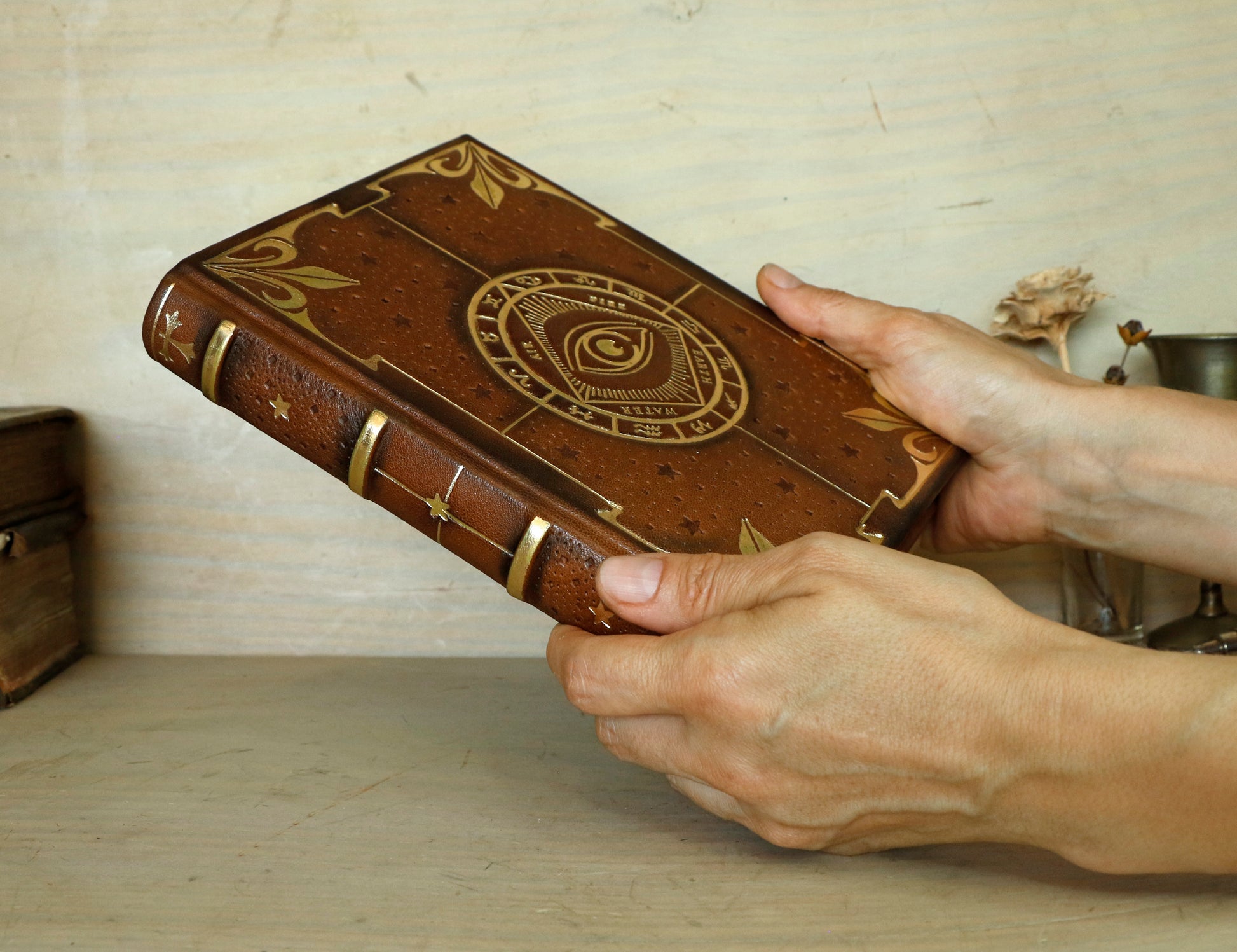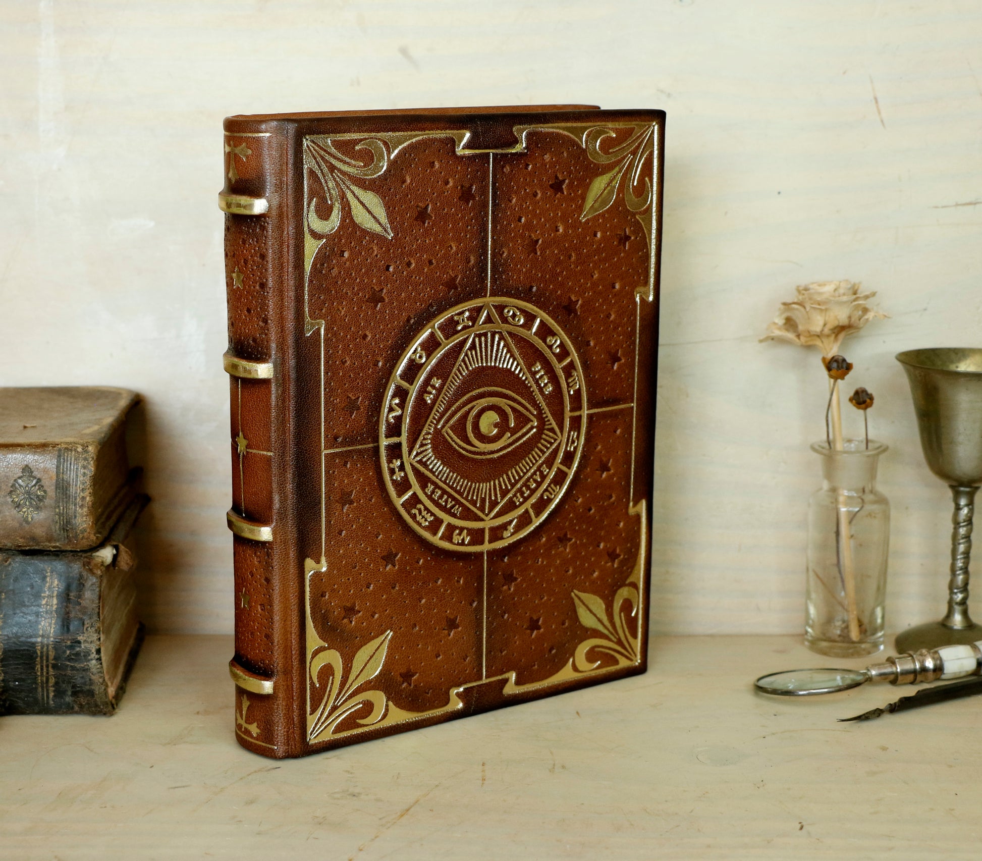 Brown leather journal with tooled decoration, The Circle of Time in Gold