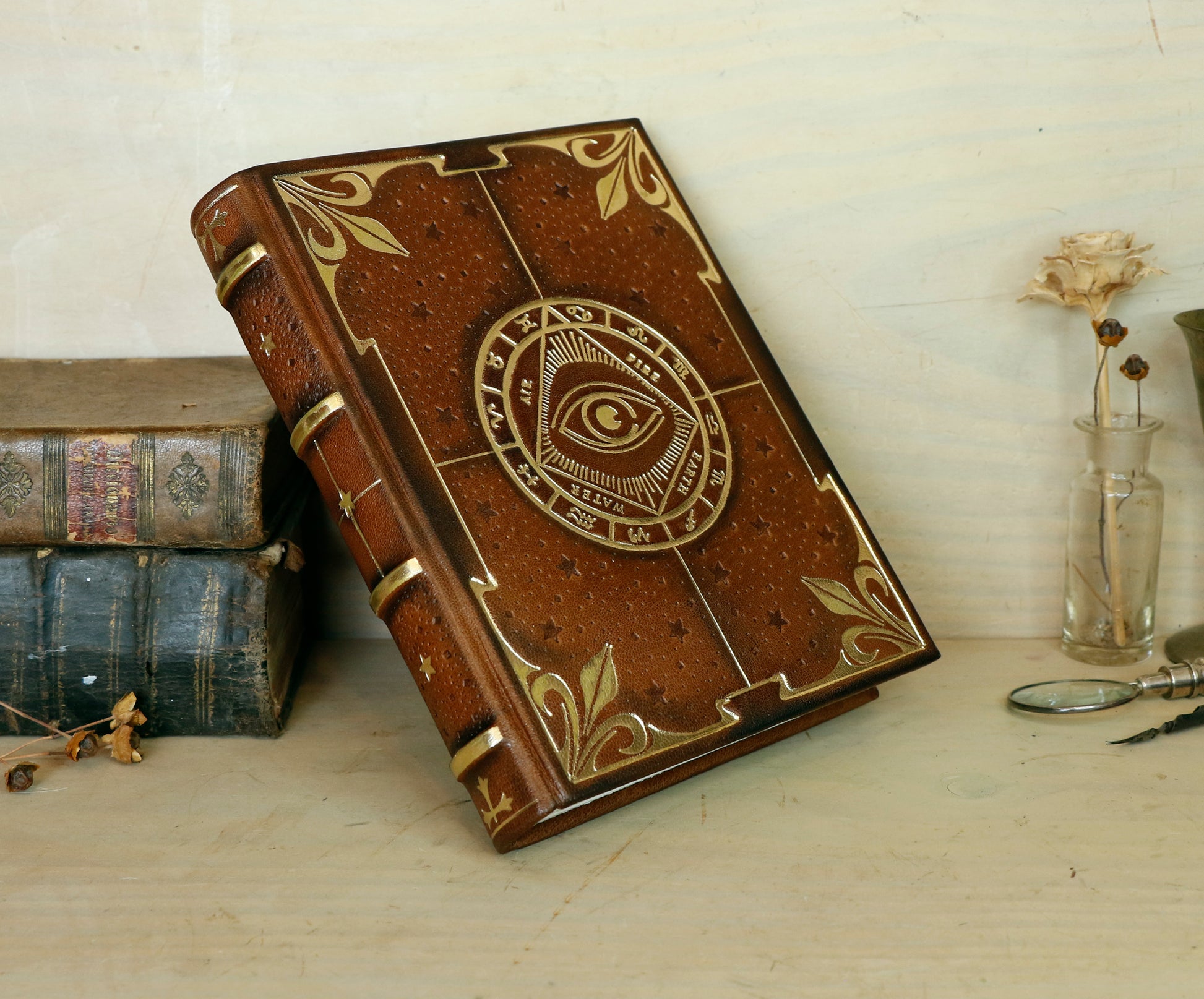 This journal is bound in antiqued brown goatskin. It was designed to resemble a mysterious tome. The decoration was gold tooled and stamped into the leather, each element at the time. Some elements were blind tooled to give the book a textured feel. A patina was applied to fit the overall antique look of this book.