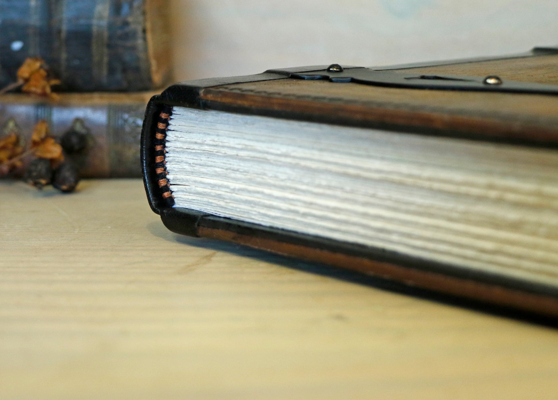 This one of a kind blank book is made of brown leather, hand dyed with an enhanced antique look. The patina this piece has is giving it character and creates an original art piece that reminds of a medieval tome.