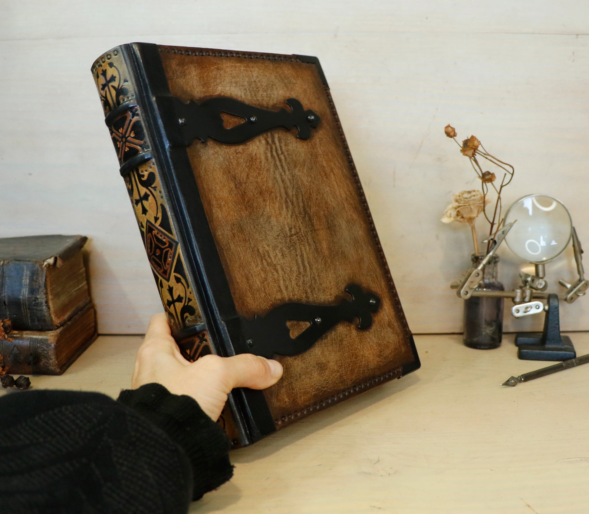 The design features two pairs of black metal hinges and decorative corners to match. A decorative line of circles was tooled around the edges. The spine was hand painted and tooled to create a beautiful and detailed decorative element.