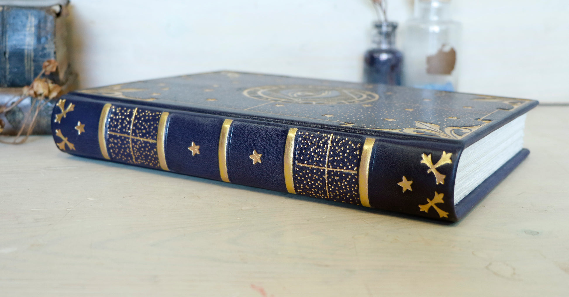 This journal is bound in dark blue goatskin. It was designed to resemble a mysterious tome. The decoration was tooled and stamped with gold foil onto the leather, each element at the time. The dark blue contrasting with the antique gold give an overall antique look to this book.