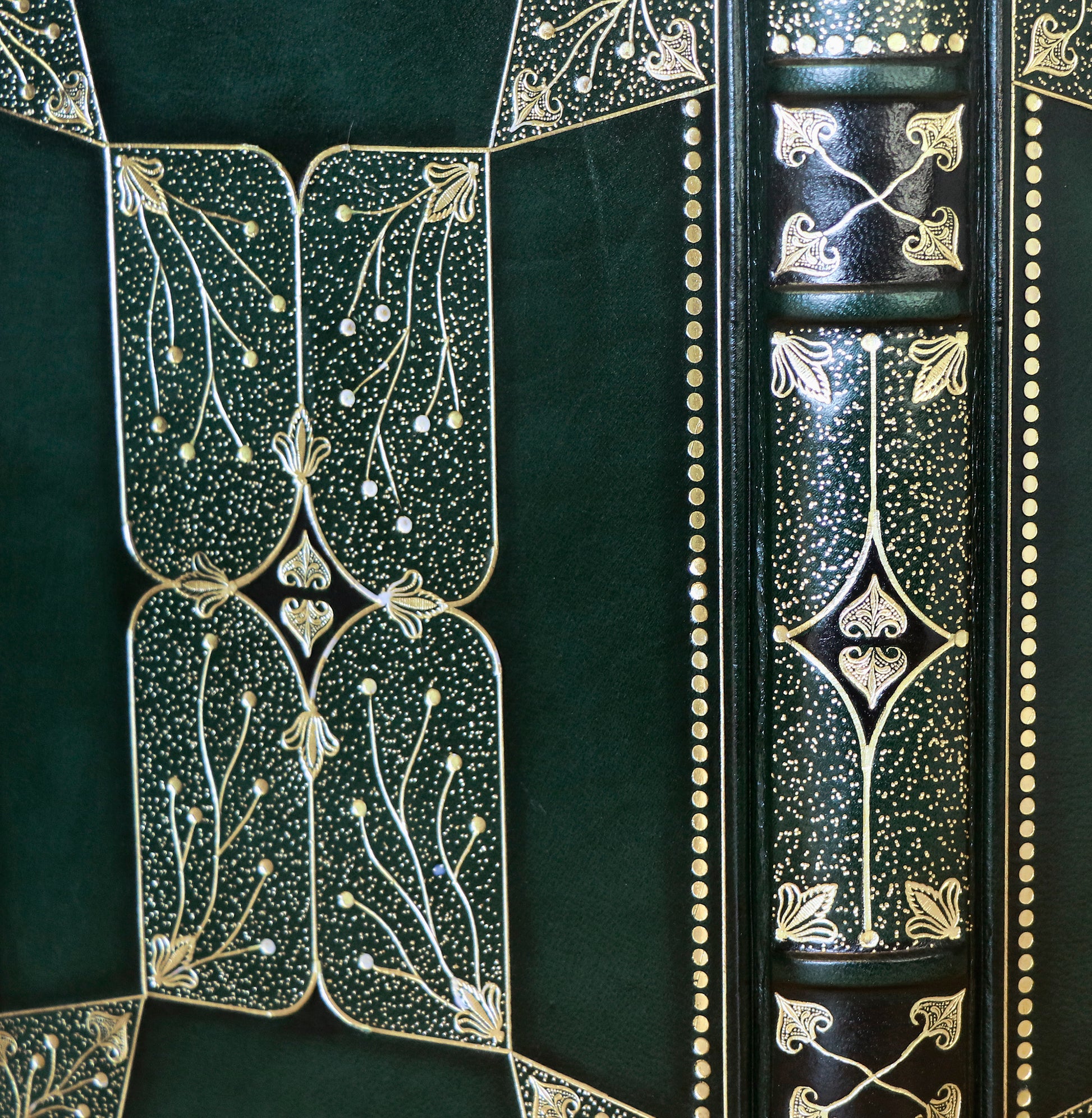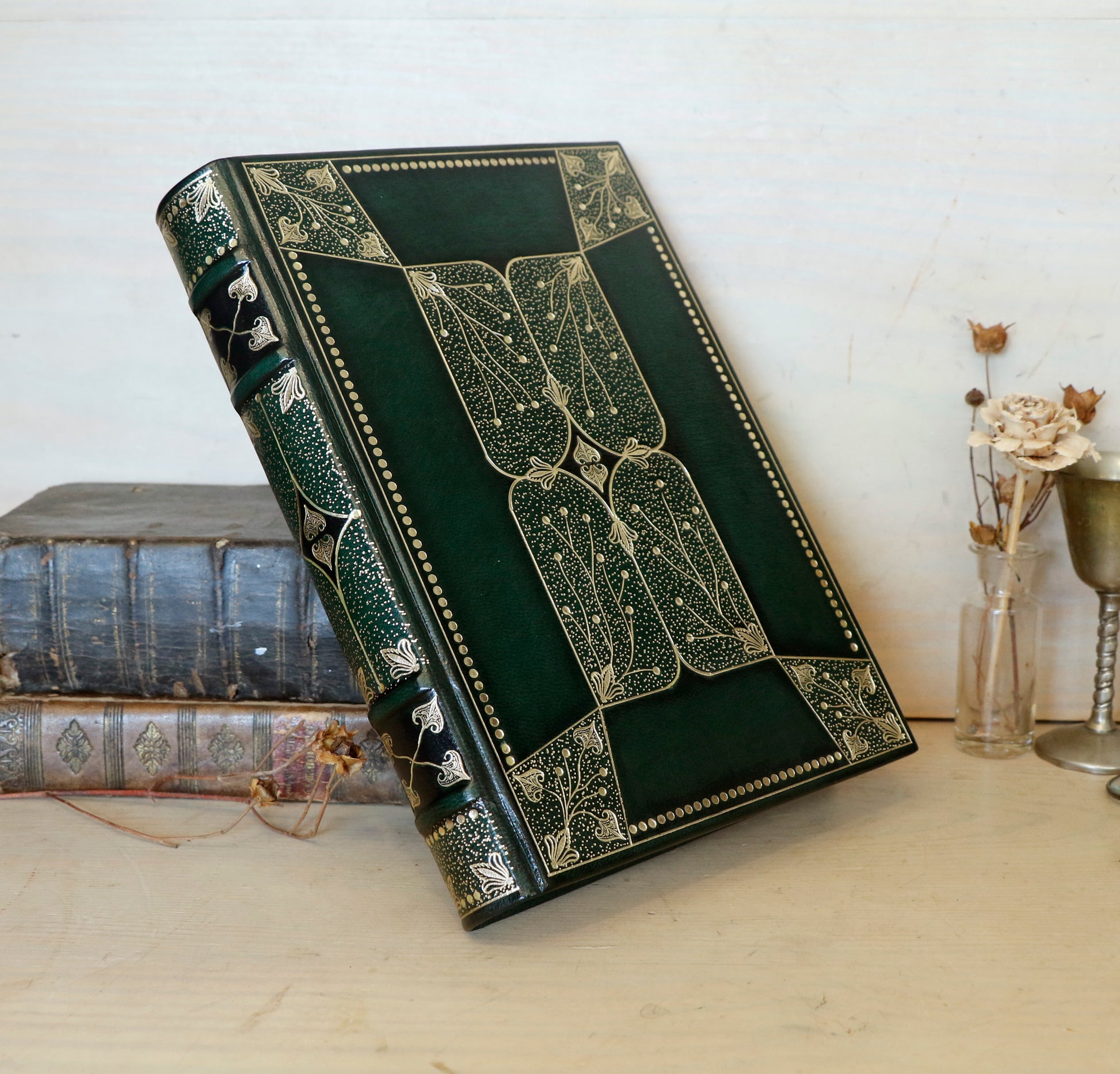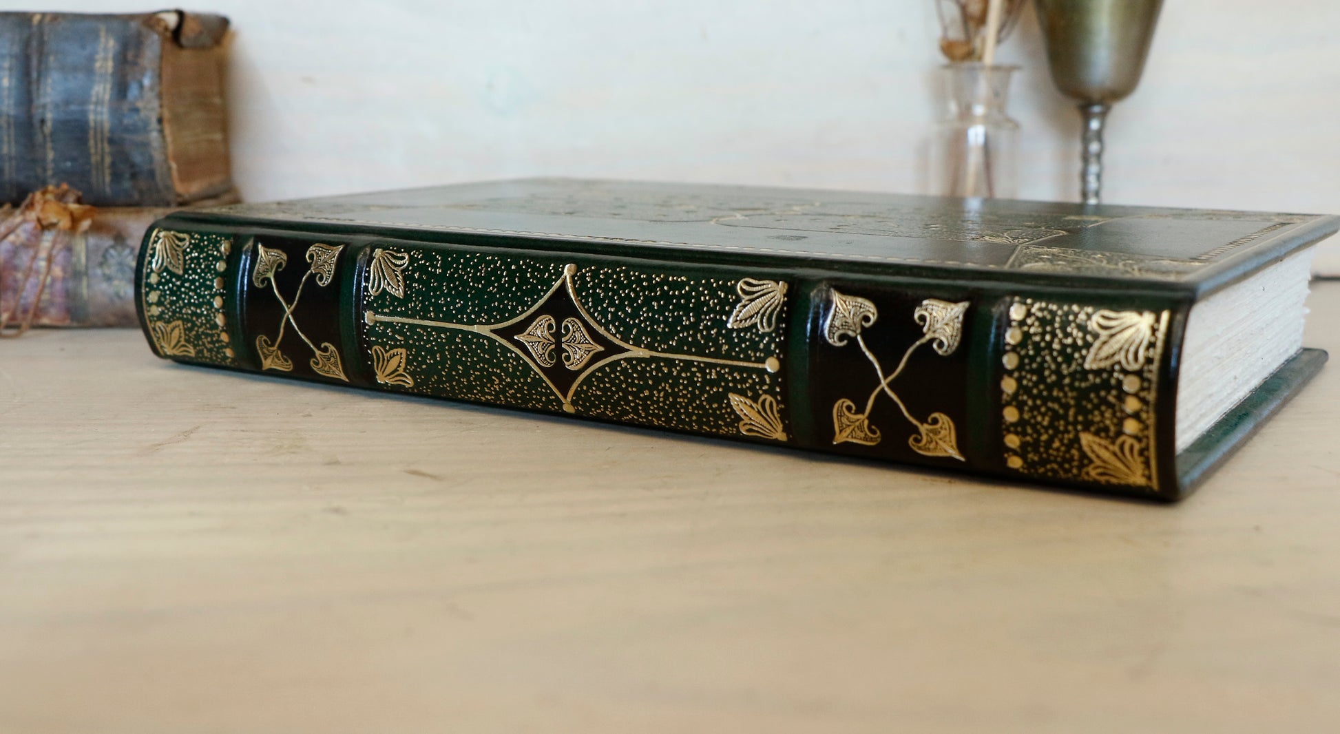 Dark Green Leather Journal with Gold Tooled Decoration. Romantic Journey