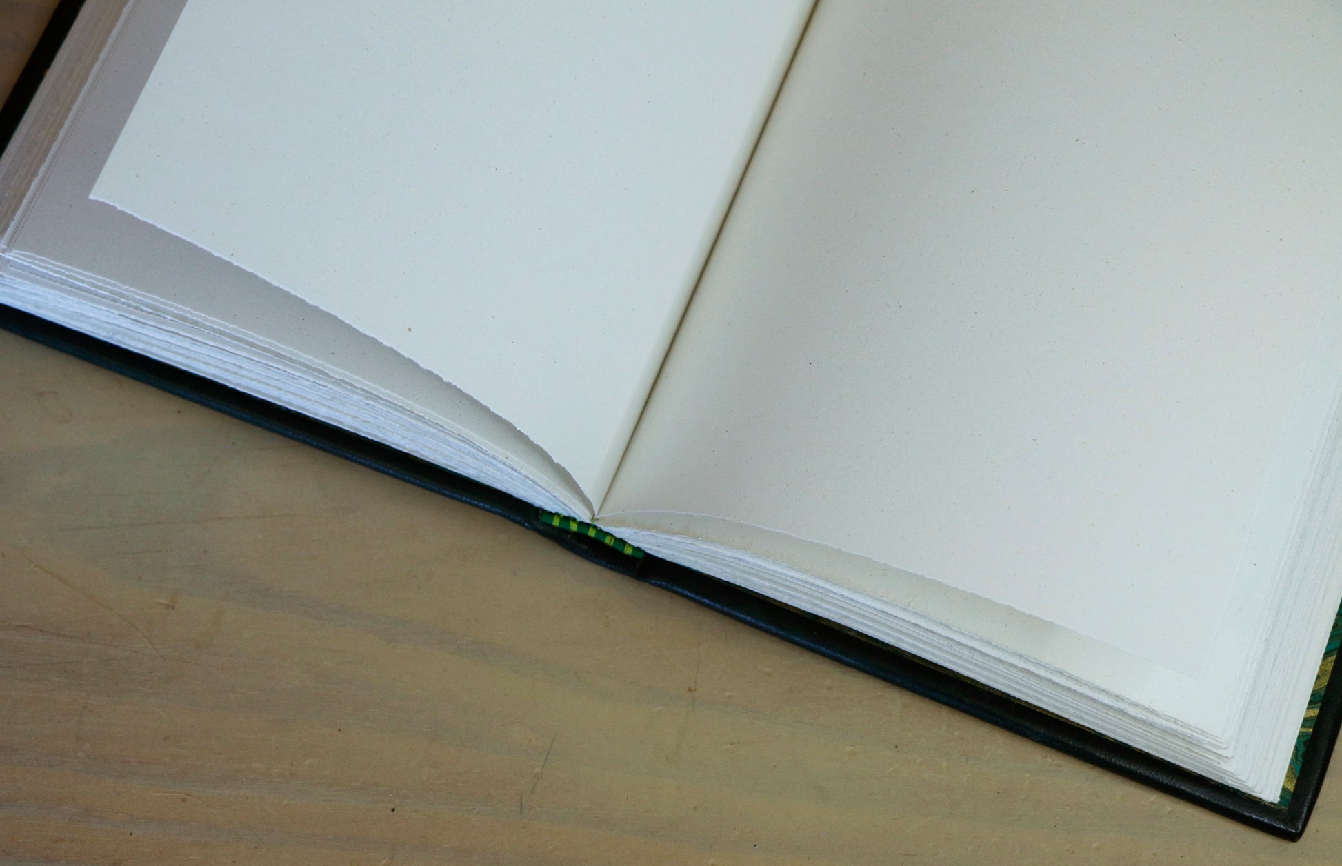 The notebook measures a little over 6x8 inches (16x21 cm). It has 150 pages (300 sides) of Favini Shiro Alga paper, an ecological paper produced from algae in Venice Lagoon. The seaweed particles are visible on the surface to give a unique natural look and its ivory color makes it fit perfectly the overall old feel of this book. The paper is hand torn, has 120gsm, and it will hold well ink, dip pens, gel and ball pens, markers and any dry media.