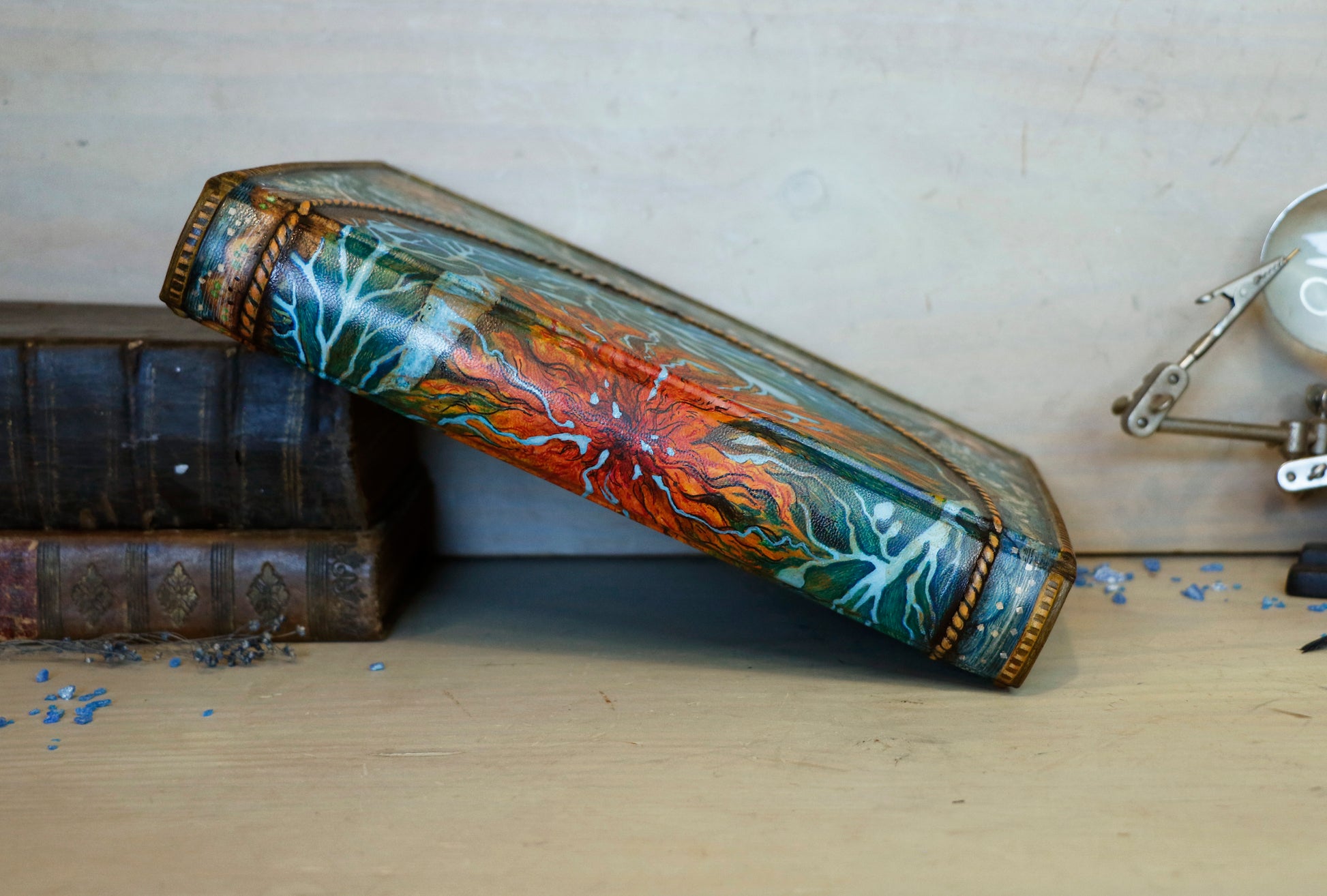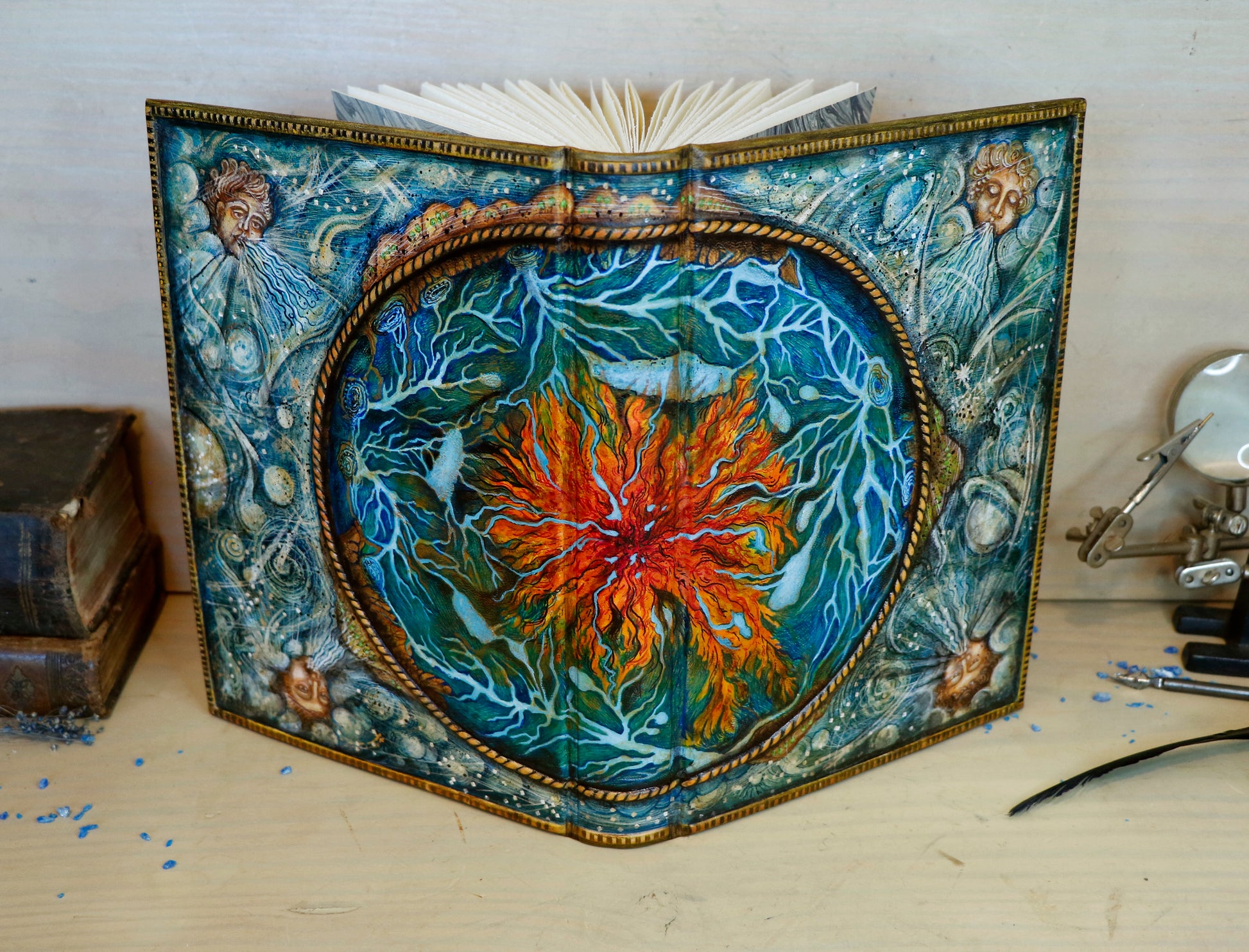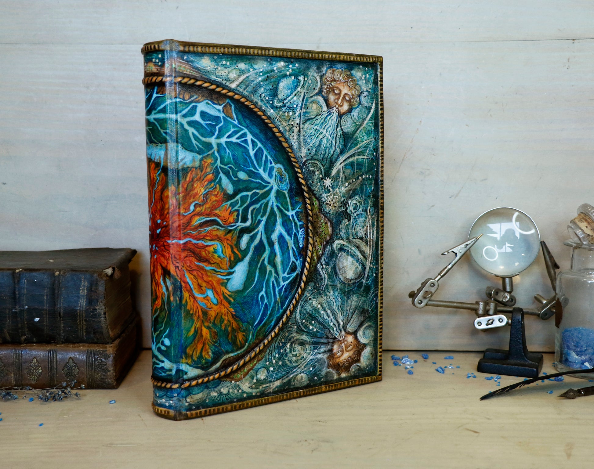 This one of a kind journal is bound in natural undyed leather and hand painted, inspired by an illustration from Mundus Subterraneus, a scientific textbook from 1665 written by Athanasius Kircher (The subterranean world, all its riches). The work depicts the imaginary geography of Earth. This cross section of the Earth, originally black and white, is my vision in vivid colors of the planet with a fiery explosion of fire at its center, surrounded by water springs, ocean currents and pathways. The Earth is set within a cosmic landscape with flying comets, planets, nebulae, a complete alchemical fusion of fire, water, air, and perhaps spirit.