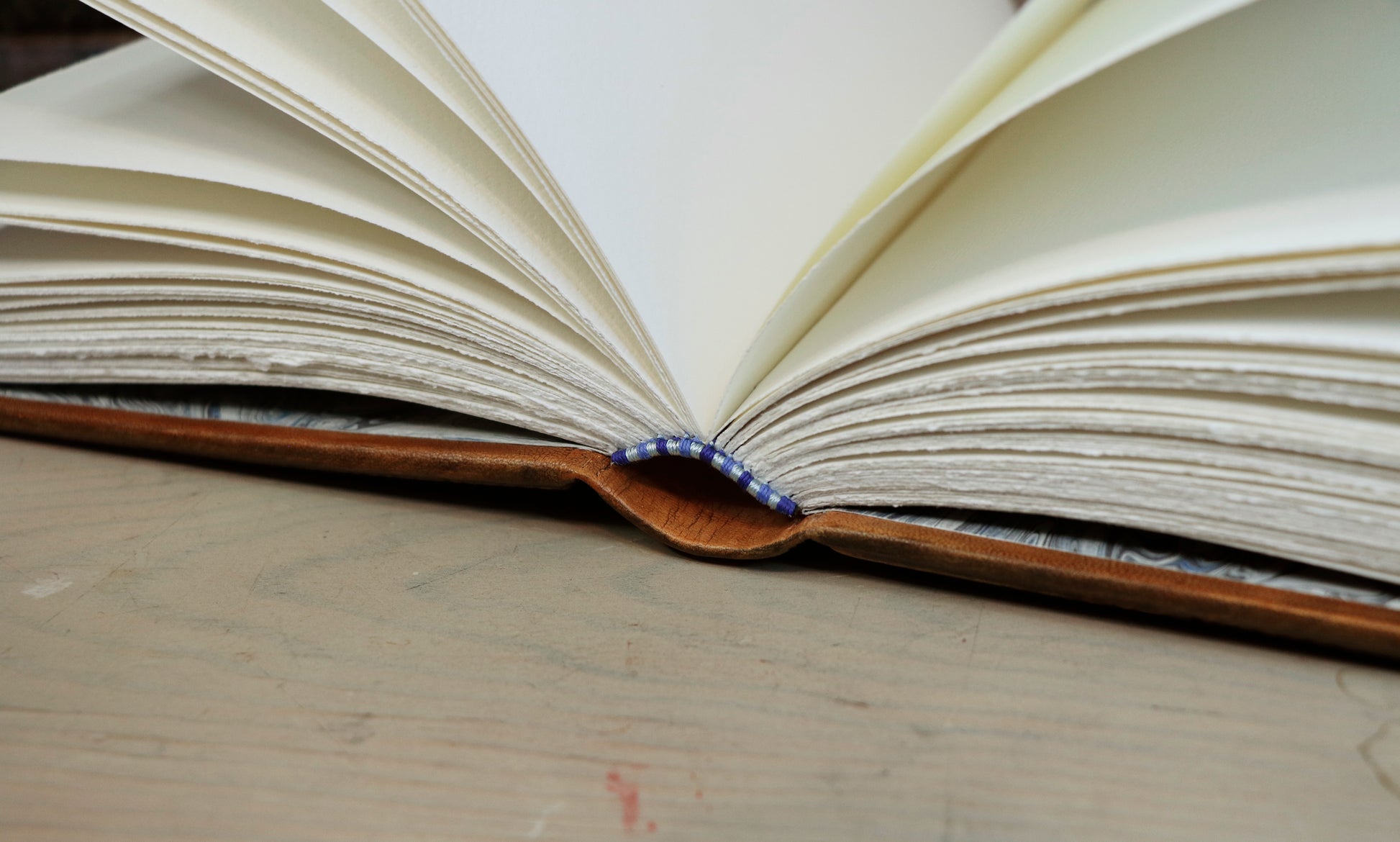 The endpages are made of hand marbled paper with white, blue and grey veins. The headbands were hand sewn using thread in three tones of blue.