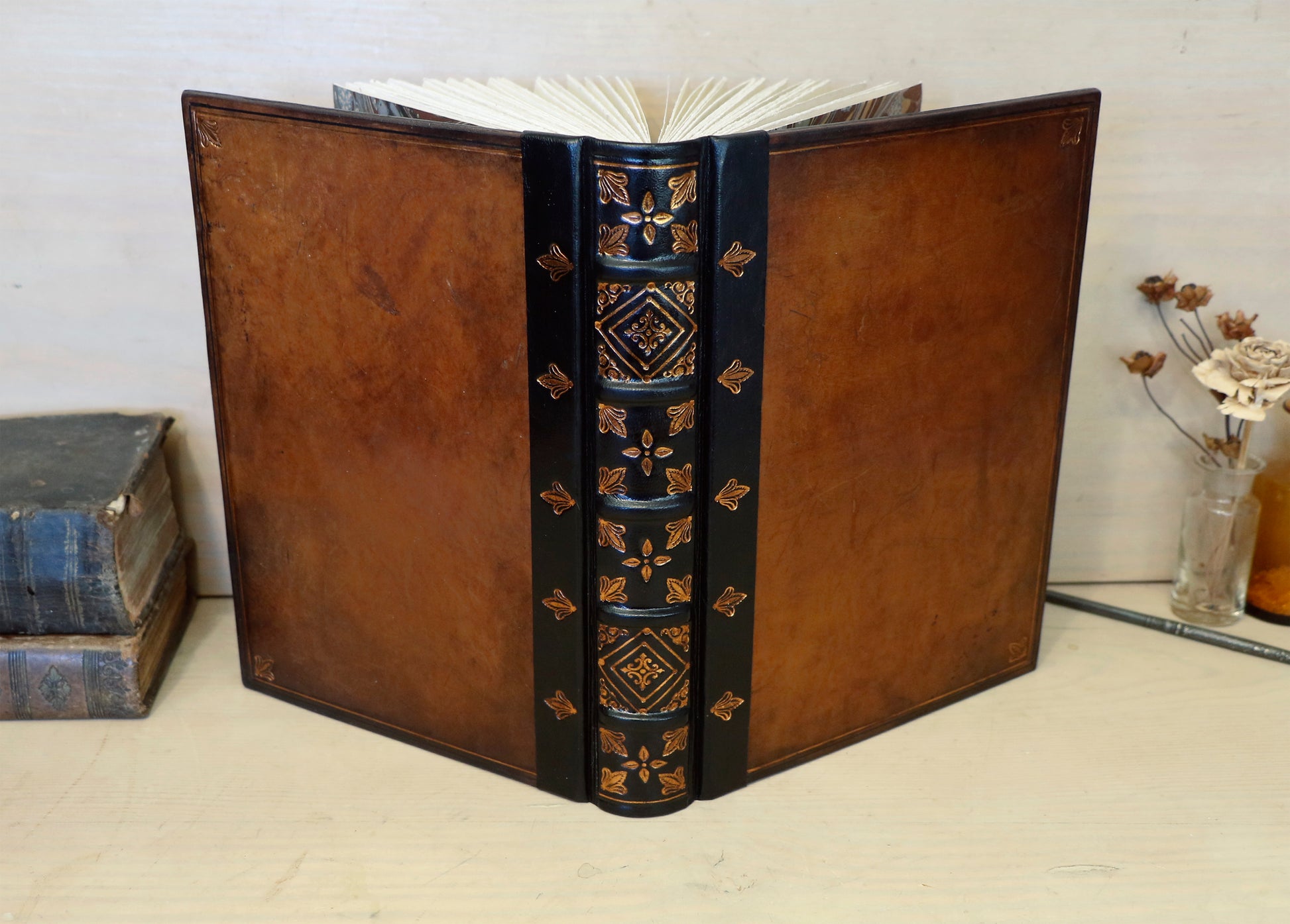 Antiqued leather journal, brown leather, Gold tooled decoration. Once Upon a Time