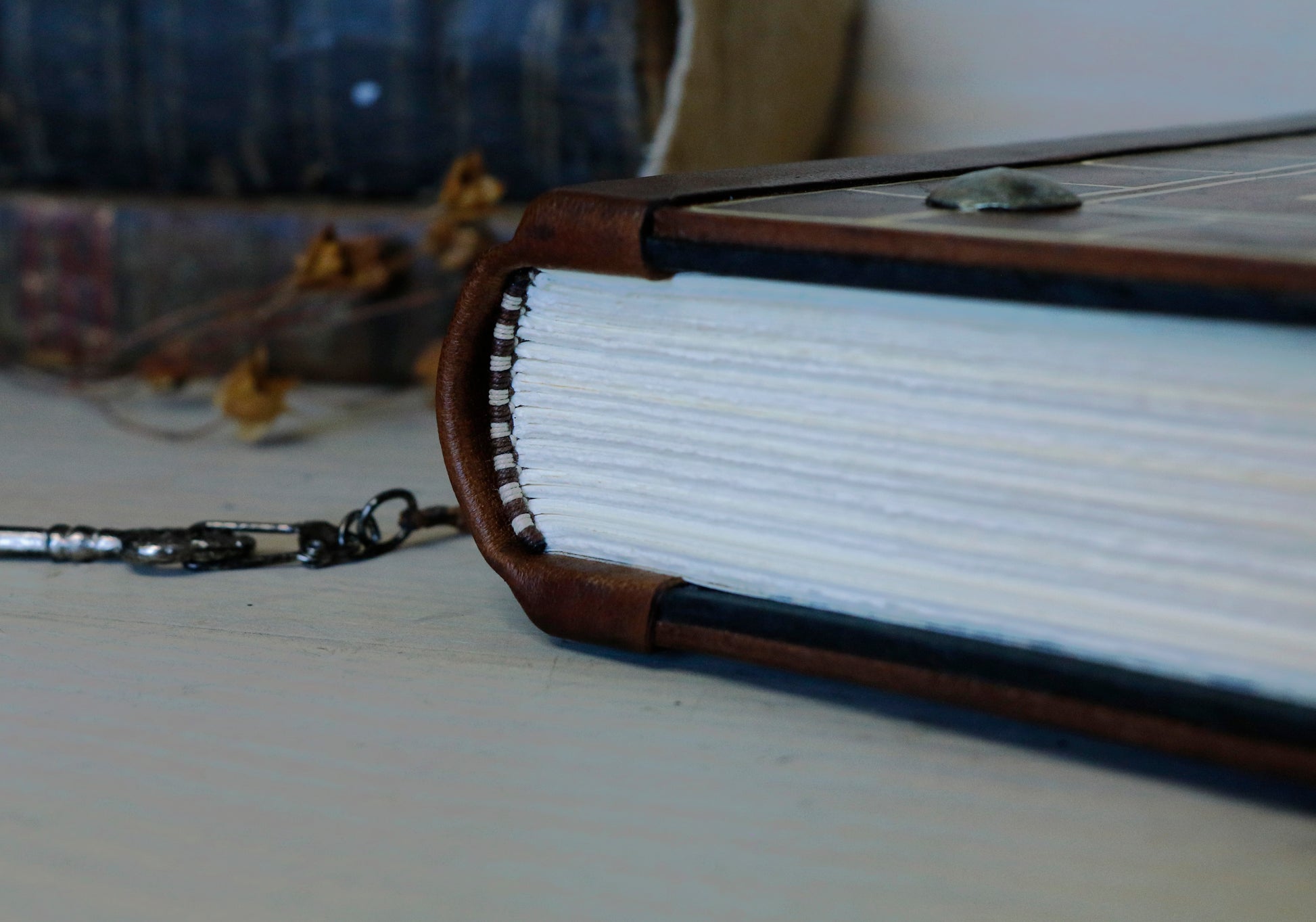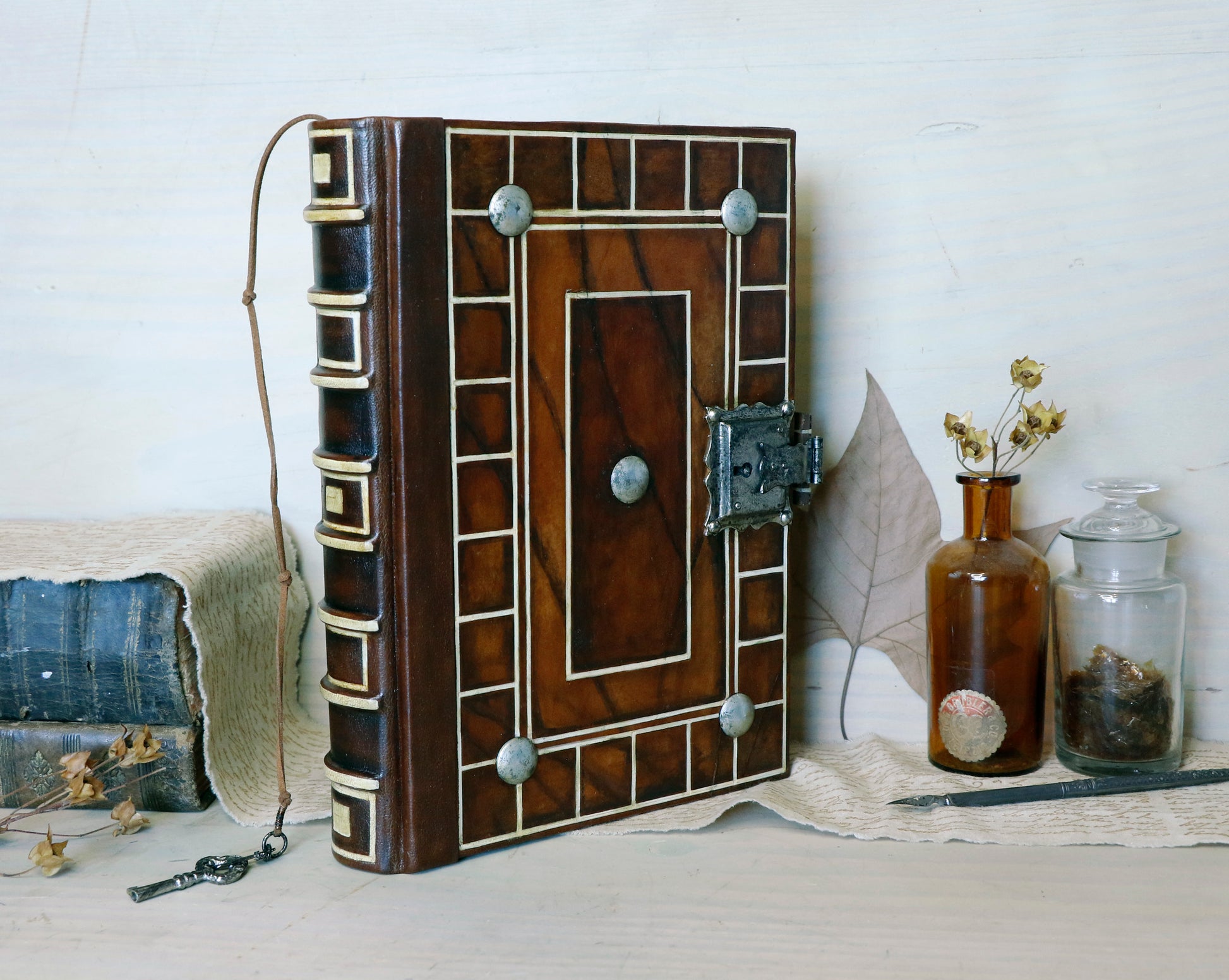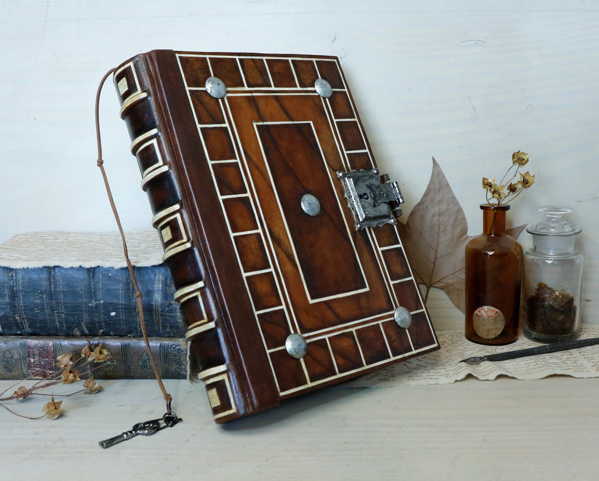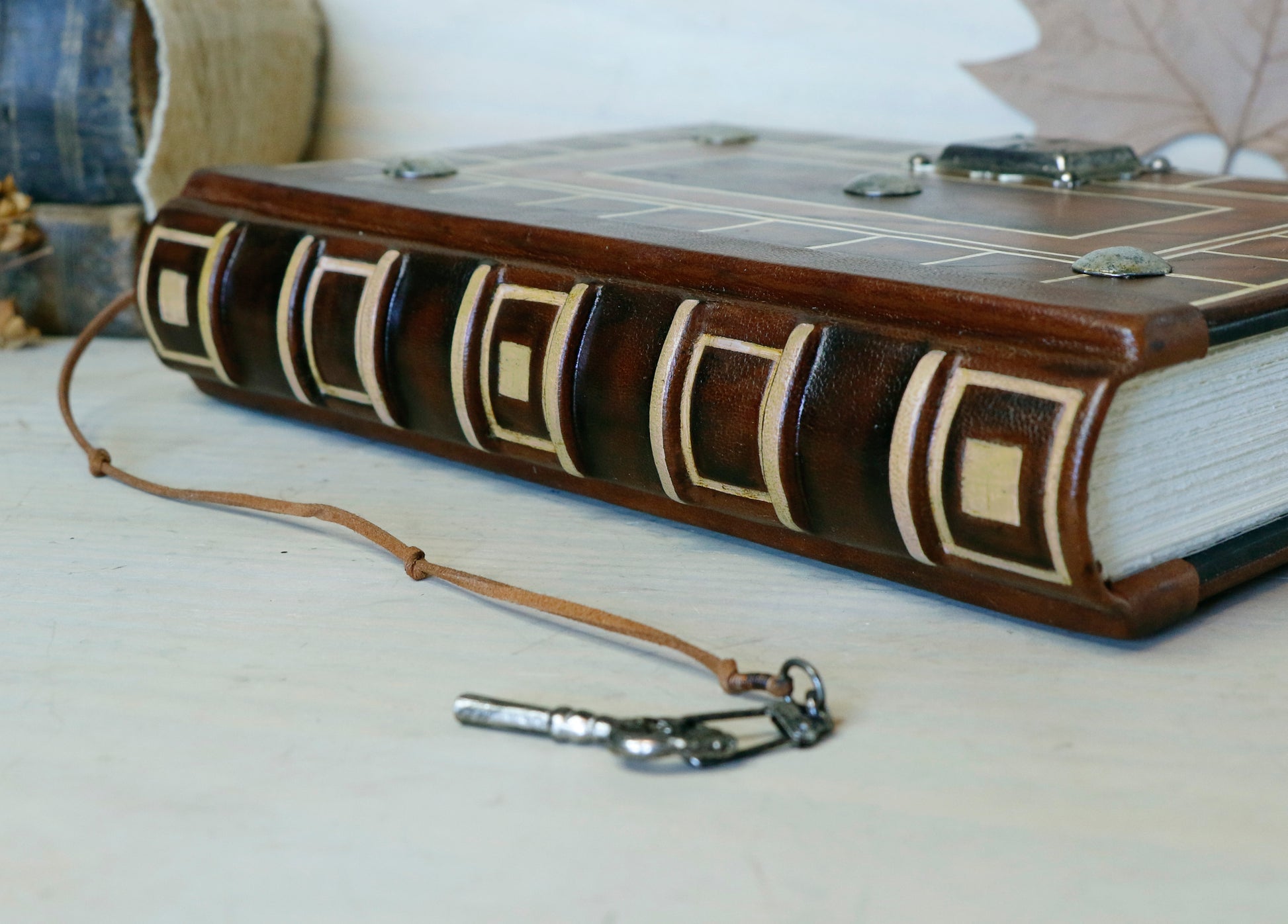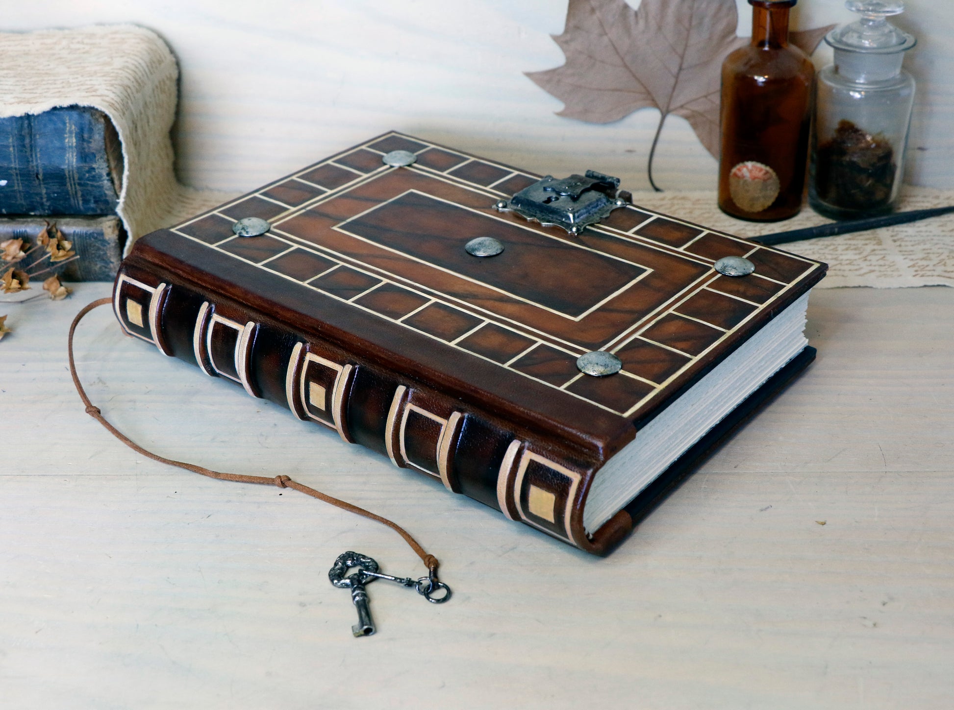 This lockable leather journal is made of natural thick leather, dyed and antiqued by hand in brown tones. It was designed to resemble a medieval tome. The book closes with a functional lock and key to keep your writings safe. The metal brads placed in the corners and the lock have a patina to fit the overall antique look of this book. The brads will allow it to lay flat when opened but the surface of the covers will never enter in contact with the table and thus will protect the decoration from scratching. The decoration is done by tooling with white foil, each element at a time .