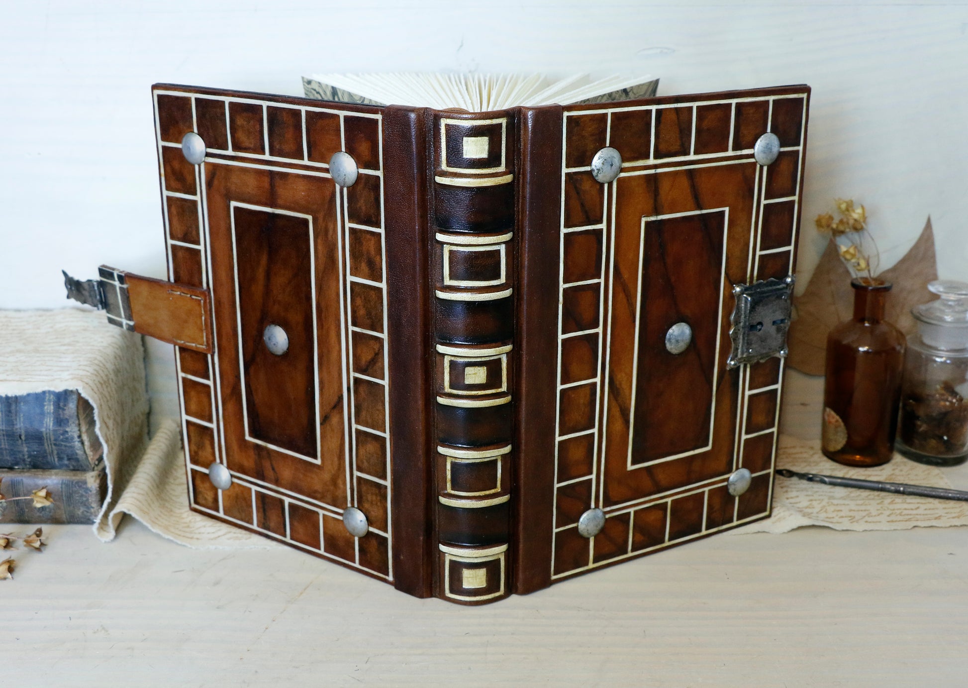 The headbands are sewn from beige and brown waxed cotton thread. The endpapers are hand marbled in brown and black tones.