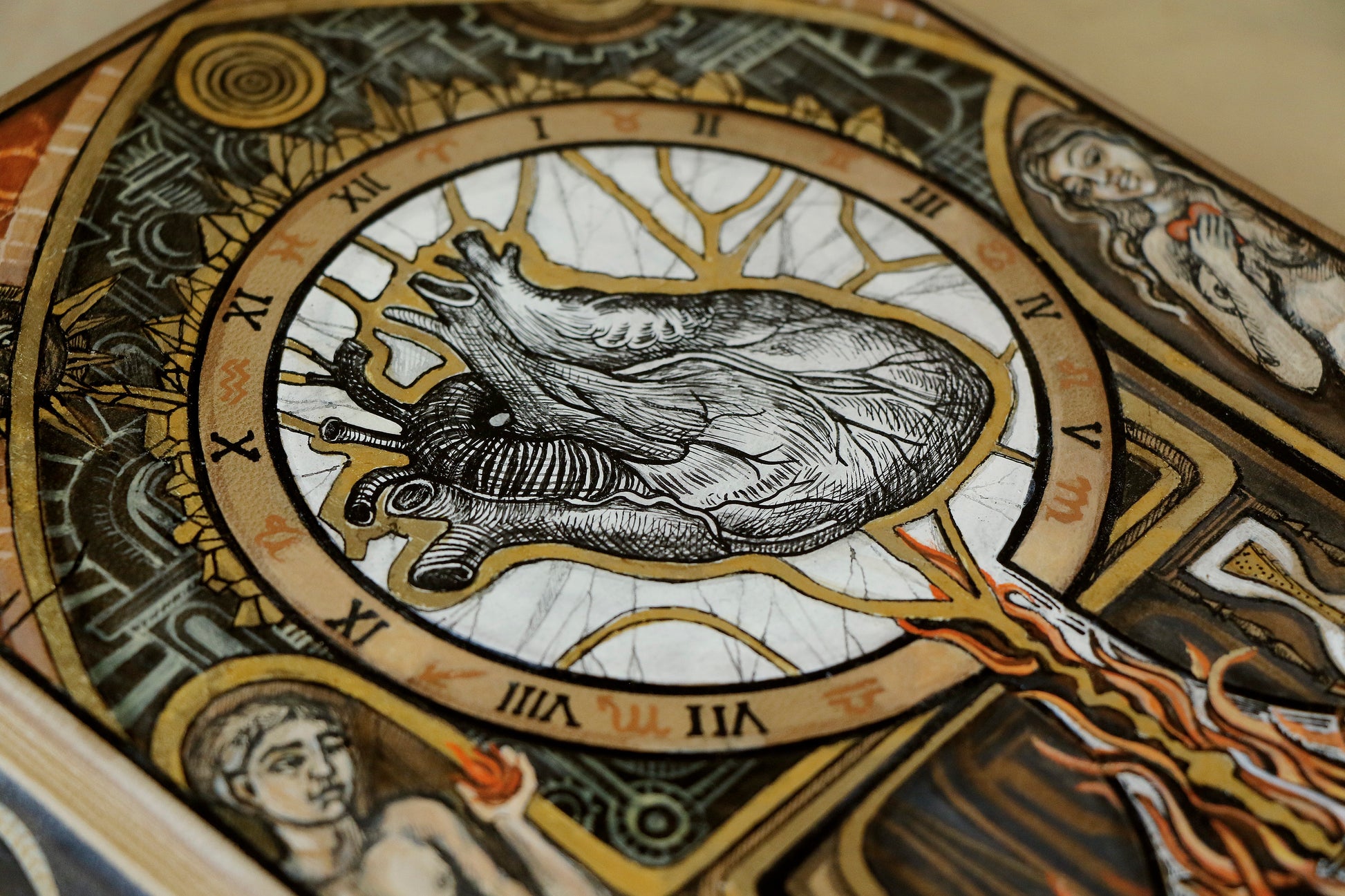 This journal is bound in natural undyed leather, tooled and hand painted with my original artwork. I designed this design binding as an alchemical map of transformation, where the power of love acts as fundamental elemental force. Love, just like liquid gold in alchemy, is the magical substance flowing through our veins, crossing our internal anatomy forming meridians of the soul, in thin threads that interconnect the chambers of our heart. When we allow it to move through us without resistance, we achieve a state of emotional alchemy, finding unconditional love, balance and equilibrium within ourselves. By surrendering to its flow, by accepting its burning passion without fearing the heartbreak, we will find that we are already whole. This binding is a tribute to the beauty of being human and embracing life with its highs and its lows. Ultimately, it is about understanding that love is an internal force and it is independent of external factors.