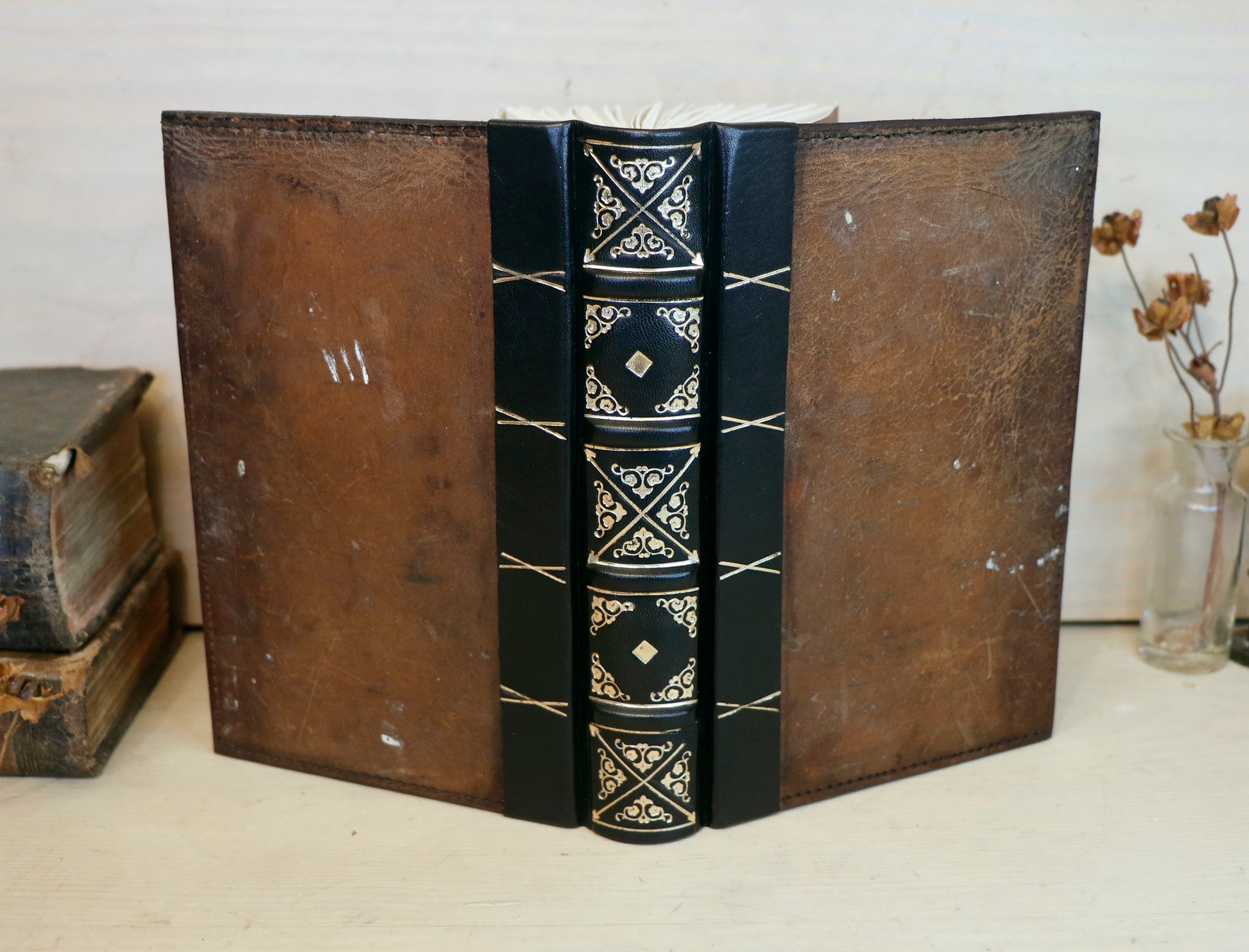 Vintage leather journal, Gold tooled decoration. The Old Book
